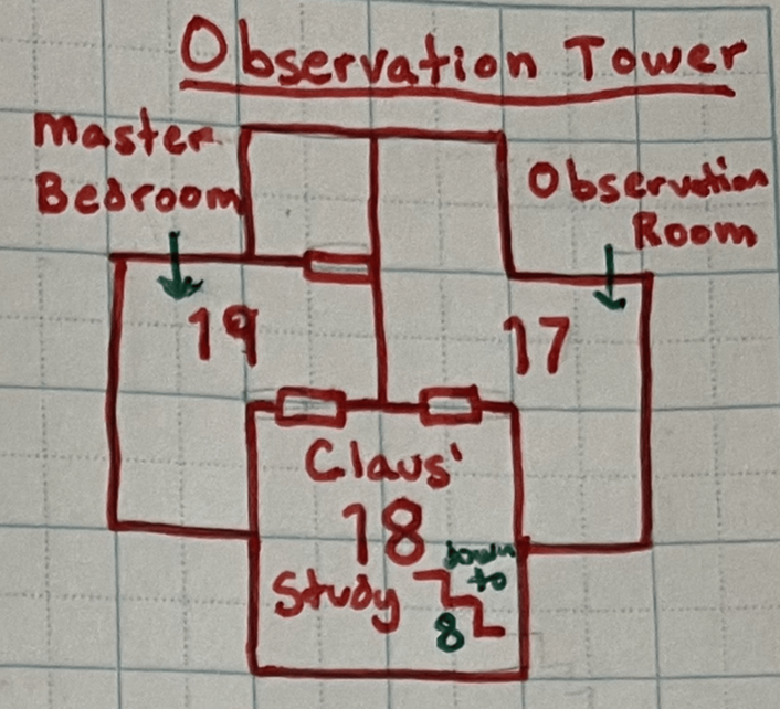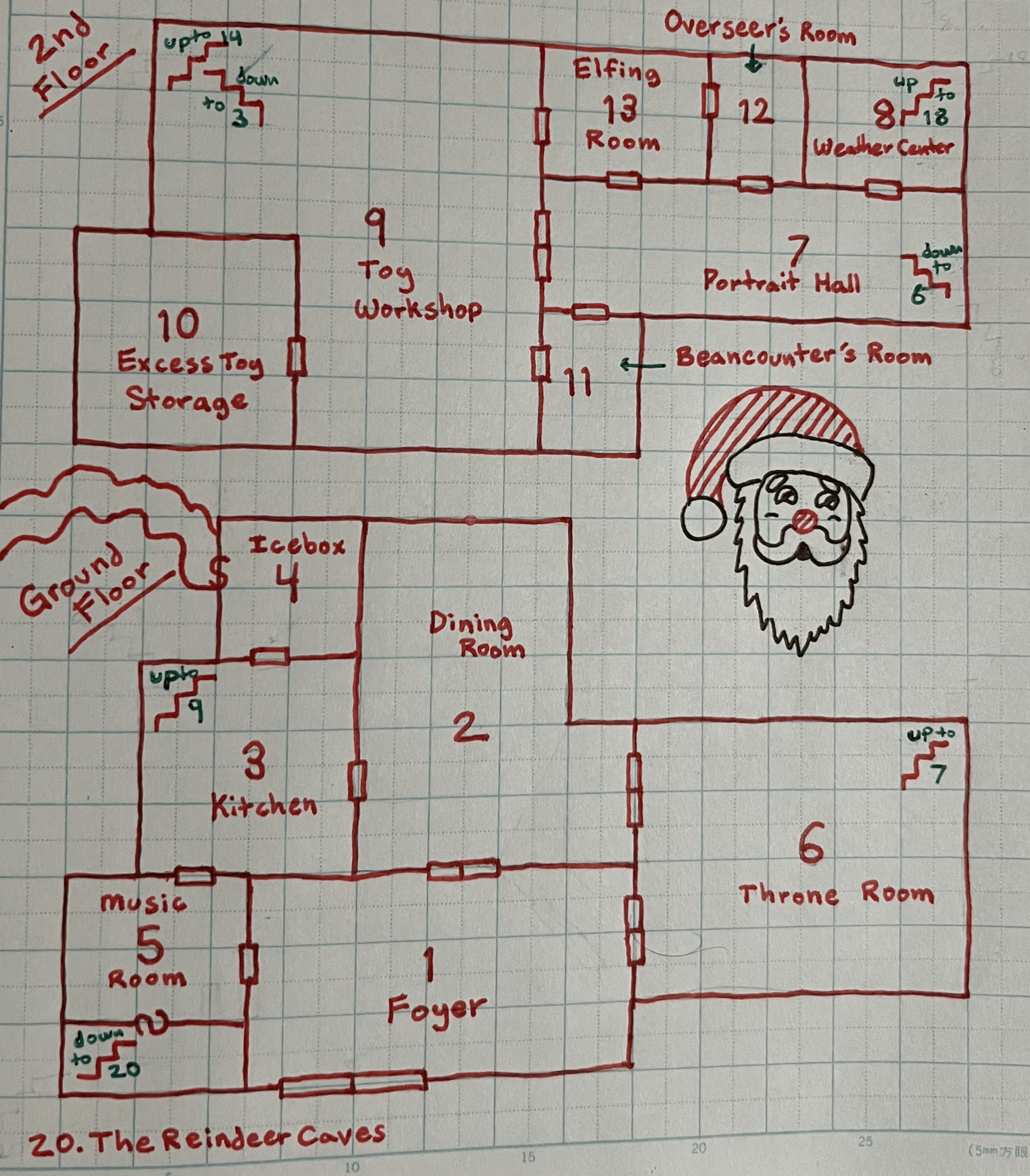 This is where the magic happens. Specifically, it is where the King-in-Red and the Queens-in-Green perform their most powerful spells. The floor is covered with previous pentagrams and broken salt circles from prior incantations. If Santa or any of the Mrs. Clauses are encountered (via random encounter or, if it is night but not the week of or leading up to Christmas, on a 4-in-6 chance [(1) Santa, (2) Jessica, (3) Mary, (4) Holly]) in this room, they are asleep, except for Holly who suffers from terrible insomnia and is taking a bubble bath in the clawfoot tub in the attached master bath. The King-in-Red snores, but it sounds less like “honk shoo” and more like “ho ho honk shoo”.