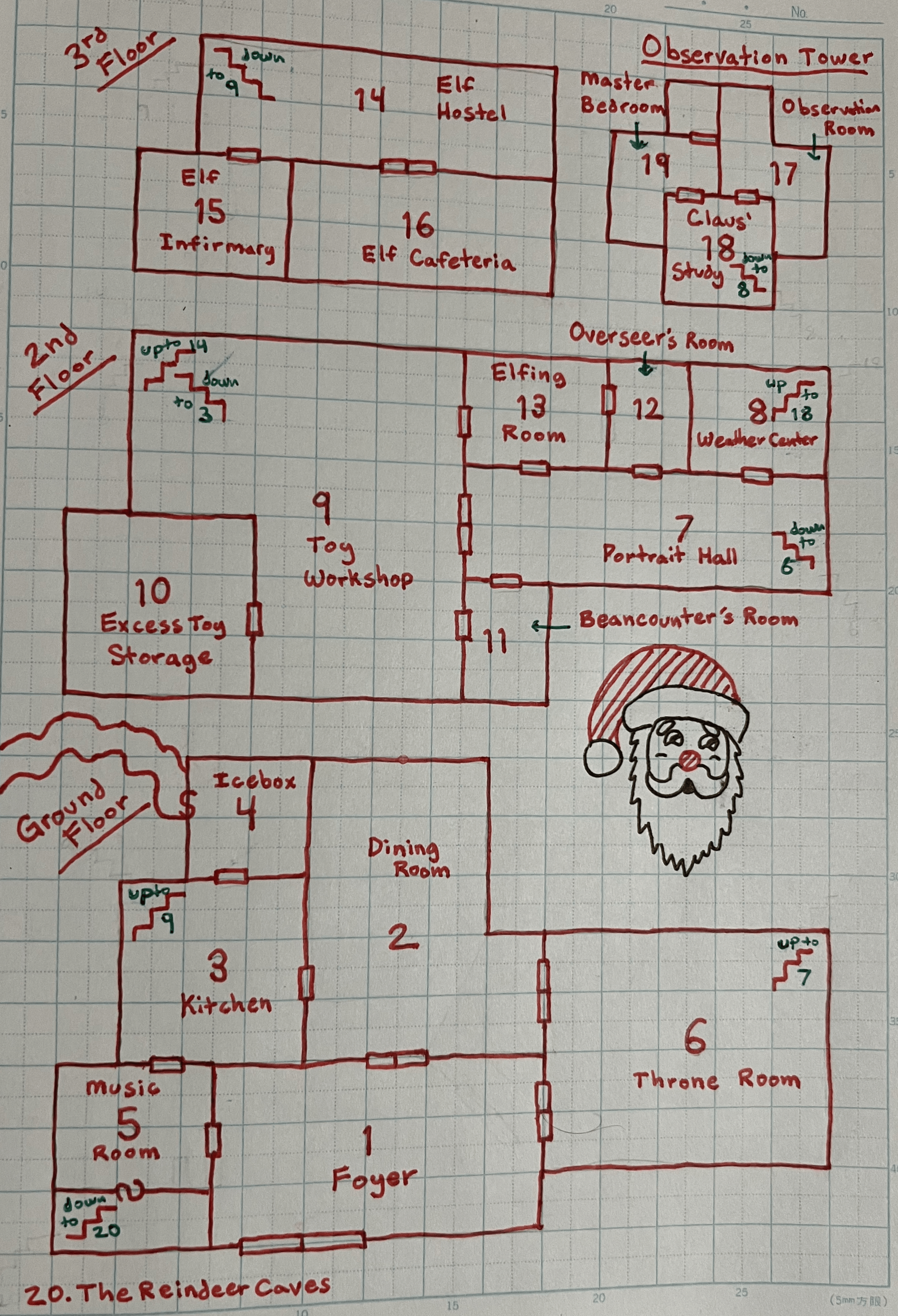 A circular room with stacks of crystal balls lining the walls. Each crystal ball is tuned to a single child and is used to surveil and track the degrees to which their behavior falls into the naughty or nice categories. Roll 1d6: (1) When not performing other important work, the King-in-Red sits in a rotating chair in the center of the room and monitors all activity on earth himself. (2-4) When he can’t make it, he will ask one of his wives to do so ([2] Jessica, [3] Mary, [4] Holly). (5-6) When all else fails, an elf named Randal is assigned the task. Randal is the harshest judge of character in the entire North Pole and has never met a single child that ever lived up to his exacting standards for moral rectitude.