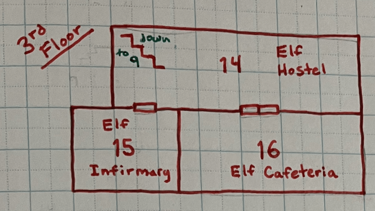 This tiny room is fit to store cloaks and spare lightbulbs but instead houses a half-picked over first aid kit and Wrangle, the elf-doctor. He is not a licensed doctor (well, he used to be a licensed DDS actually) but is chomping at the bit to do some surgery. An elf comes in with a scraped knee? Let’s remove the leg. An elf comes in with a stomach ache? We need an organ donor, stat! An elf comes in with a throbbing head from a late night of hitting the eggnog a bit too hard? Off with his head.