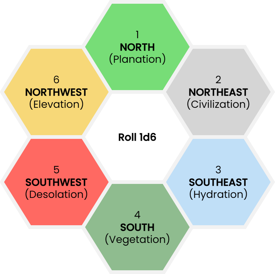 A baked-in drawback of this method is that certain terrain types are going to appear more frequently in certain directions of the map. That may be obvious from the procedure itself, but it is worth noting because of how you can adjust this drawback to fit your circumstances. If you have a general idea of what the region you are using this procedure looks like (e.g., in what direction is the ocean, where are the mountains, in which direction have most folks settled), then you should change the designations for each of the enumerated results to align with that information. For instance, if I were stocking a hexmap that I ultimately want to resemble California, I’ll move Vegetation to the #1 (North) result, Elevation to #2 (Northeast), Desolation to #3 (Southeast), Hydration to #5 (Southwest), and Civilization to #6 (Northwest), which roughly correspond to where those types of terrain are found on America’s left coast.