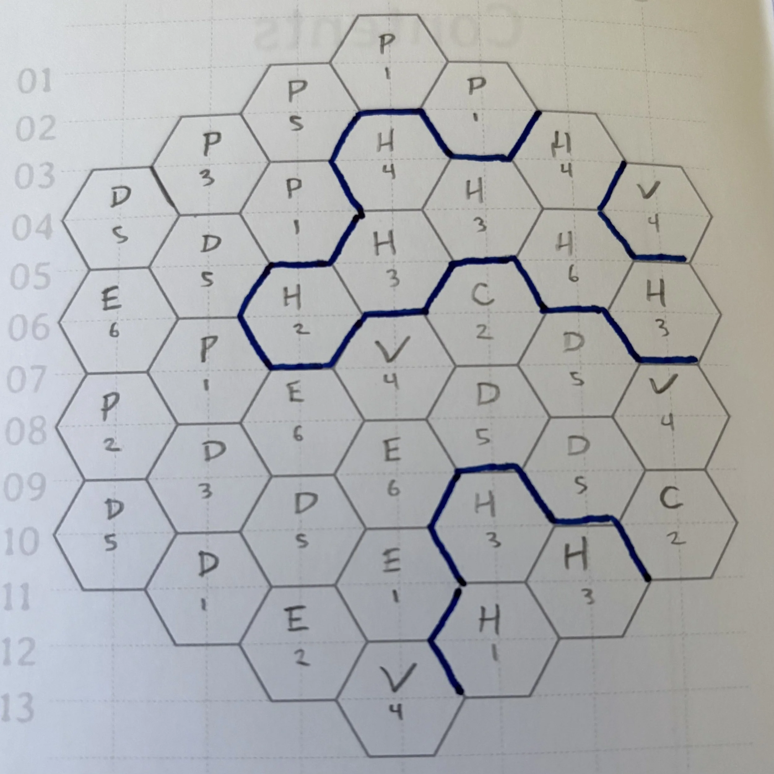 4. Once all of the hexes on the map are filled in with the hex type, for each hex determine the hex contents based on the hex type as each is described below. Run down the conditional statements in order. The first conditional statement that is true determines the dominant terrain of the hex (I don’t usually do this in order, I usually start with Hydration and Elevation, then Civilization before moving onto the remaining hex types).