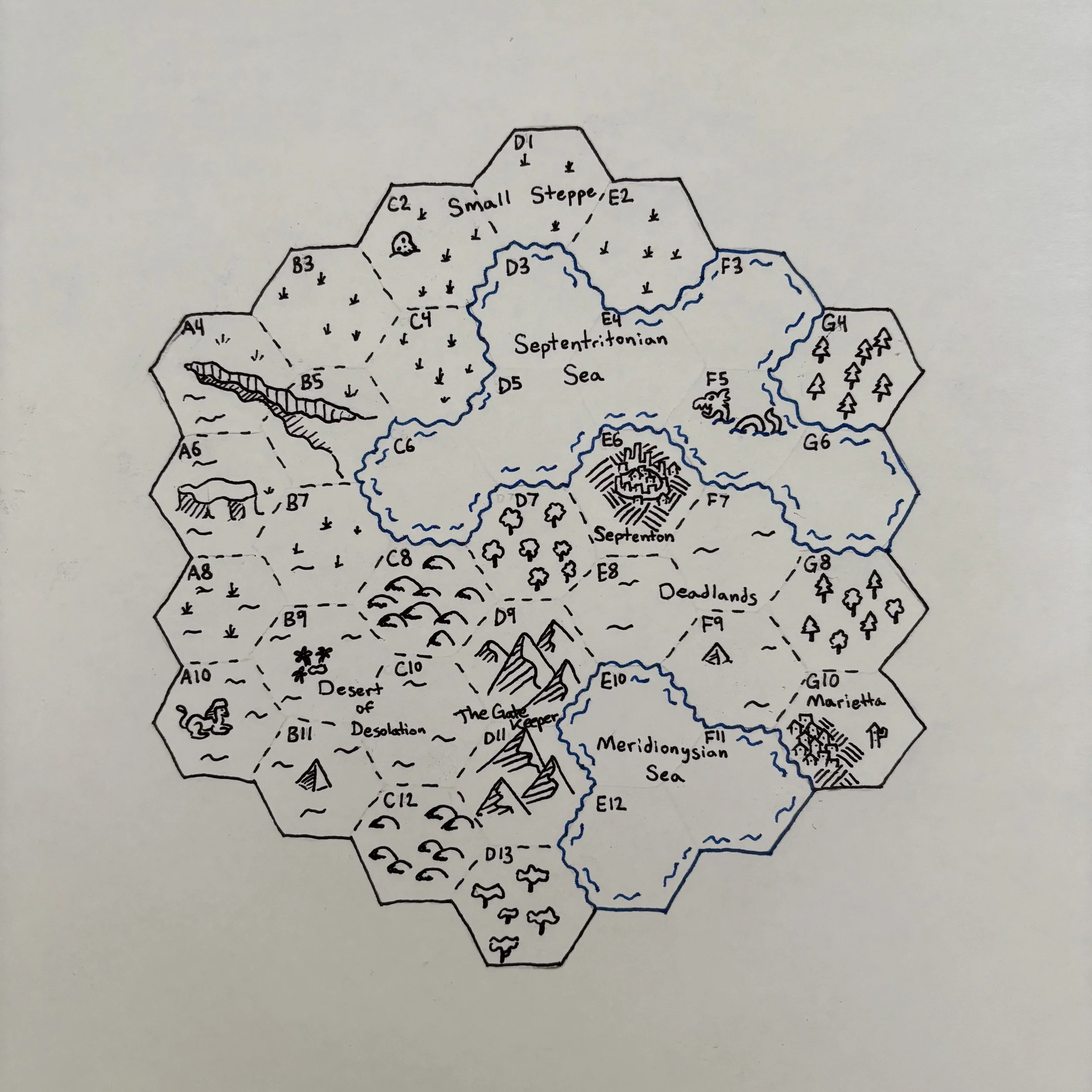 G10: Rolled a 2, which indicates Civilization. This is a very uncivilized region! This is another port town by the sea, and we will name it “Marietta”. It has long been at war with its neighbor, Septenton.