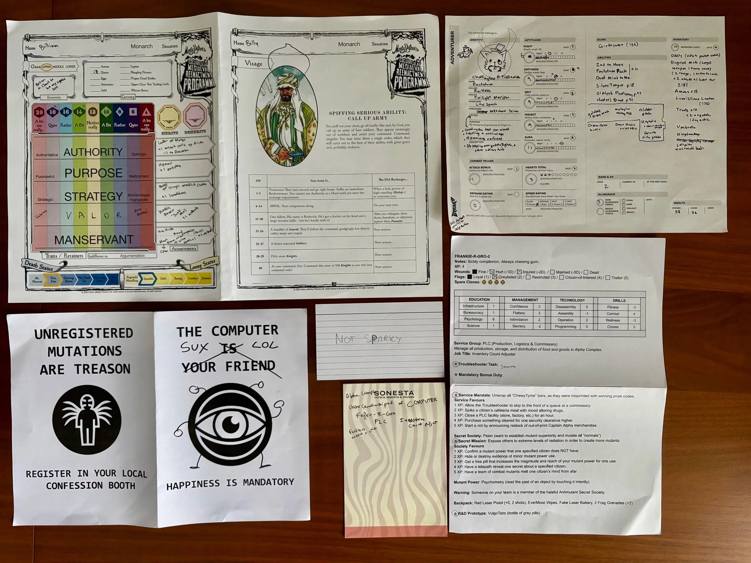 Collection of character sheet and character-sheet related ephemera that didn’t get lost in the great backpack explosion of 2025. Monty Python’s sheet is the largest and most luxurious.