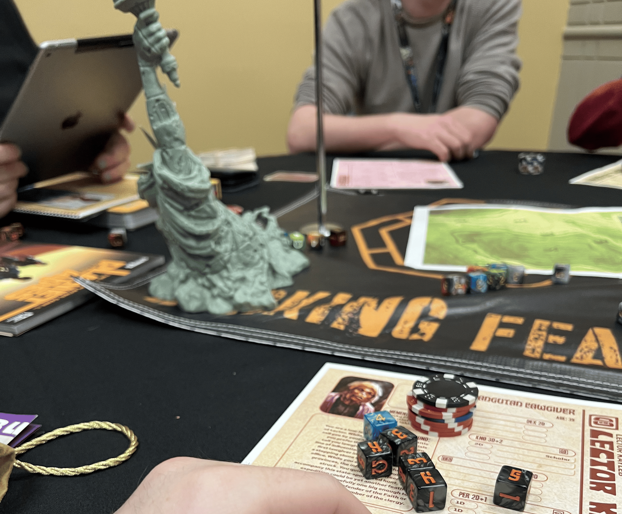 One thing of note was the system, which was based on the old West End Games Star Wars game. The game’s designer went on an interesting aside about how he appreciated how that Star Wars TTRPG ended up being a foundational text that established much of the lore of the universe going forward (and some, I assume, has even survived Disney’s takeover!), and that he wanted for the Planet of the Apes TTRPG do the same for the burgeoning multiverse that I’m sure the IP-owners envision for Apes. That is all well and good, but as a system, I was not impressed. It is a dice pool system where you may be rolling up to 10d6 (possibly more) on a single roll, but rather than simply looking for and counting 6s or some such, you sum the total of the dice, which is both time consuming but also with that many dice being rolled the bell curve becomes much less satisfying as you are ground down by the law of averages. But then again, maybe it just makes sense for a franchise based on pre-D&D era films to have stodgy mechanics from the 1980s. Perhaps it didn’t go far enough–Apes should use THAC0.