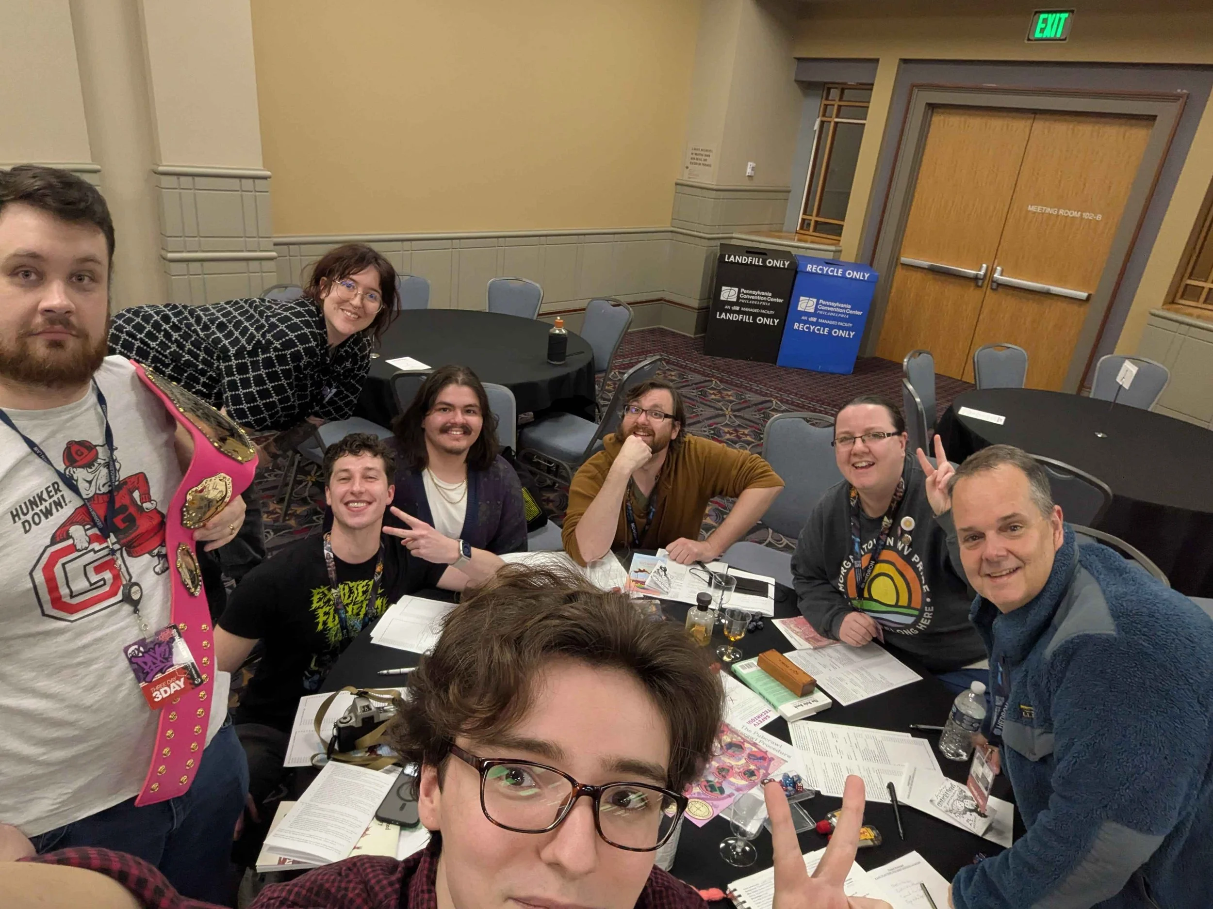 For my final TTRPG of the convention, I was in the driver’s seat. And it took some preparation to run a game far away from my ordinary base of operations. First, I had to of course pack my trusty gavel (when running for 8 people, a gavel is a must [see #4 in my TTRPG gift guide for my sound reasoning]). Then, the night before I had to make a pit stop at a local liquor store and purchase 20 Fireball shooters (i.e., approx. 50 mL containers of cinnamon-flavored whiskey, not wizards specializing in flinging that renowned spell). Finally, in the break between Break!! and Barkeep, I went to the UPS that was conveniently located within the convention hall and printed out the pregenerated characters I finished writing the prior morning and a few pamphlets of the rules I wanted to playtest alongside the module. And only then was I prepared to run Barkeep on the Borderlands for a handful of friendly fellows from my discord server.