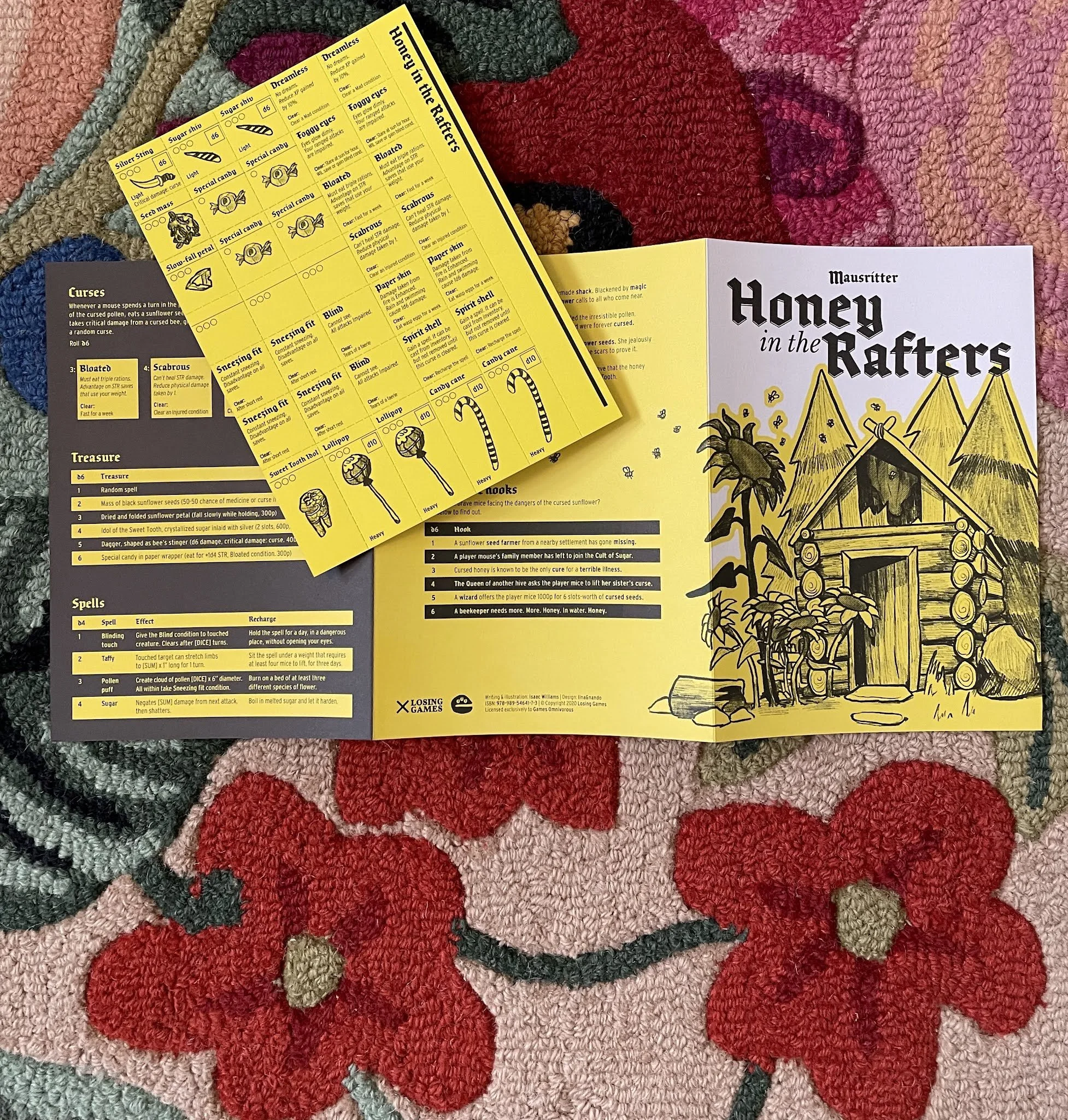 Honey in the Rafters not only demonstrates how to write a Mausritter adventure, it is also useful for would-be homebrewers curious about adding spells and items to the mix. The adventure includes a handful of spells and items that are absent from the Mausritter book (such as Taffy, allowing a mouse to stretch its limbs to unnatural proportions). Particular standouts here are the weapons—what self-respecting mouse wouldn’t wield a candy cane or lollipop instead of a sword or axe? After reading Honey in the Rafters, I am like those sugar cultists, left wanting more, more, more of the sweet stuff.